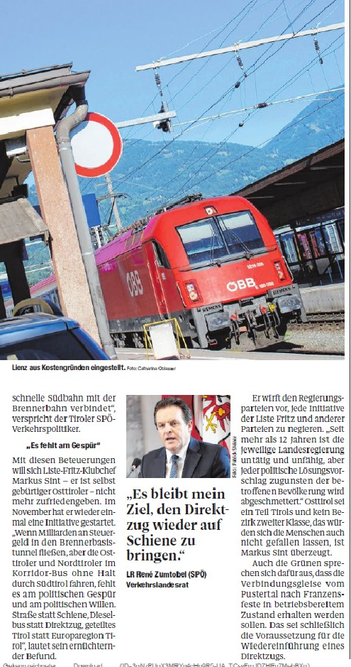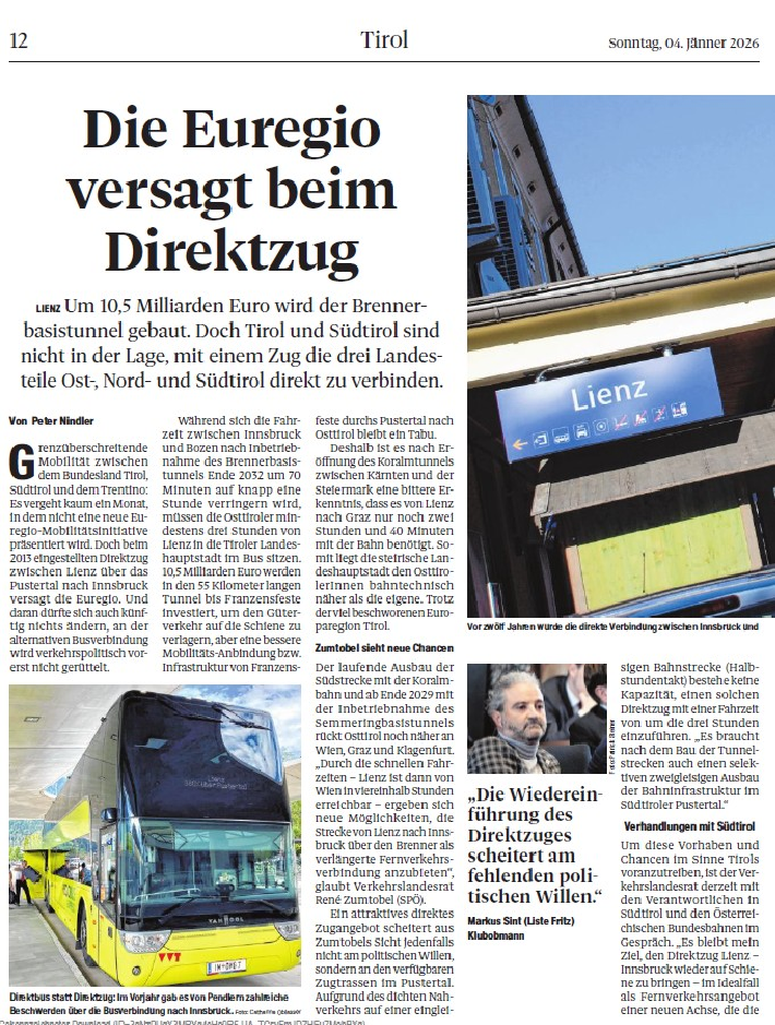 Die Opposition im Tiroler Landtag bringt im November-Landtag einen gemeinsamen Dringlichkeitsantrag zur Wiedereinführung des Direktzuges Lienz–Innsbruck ein. Die Forderung: Ein runder Tisch mit allen relevanten Stakeholdern. „Mit dem Dringlichkeitsantrag für einen runden Tisch zwischen Tirol und Südtirol wollen wir Schluss mit dem peinlichen Polit-Ping-Pong zwischen der Tiroler und Südtiroler Landesregierung machen. Daher alle an einen Tisch und die Weichen für die Wiedereinführung des Direktzuges stellen“, so Liste Fritz-Klubobmann Markus Sint.
