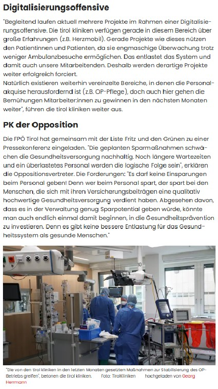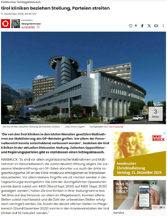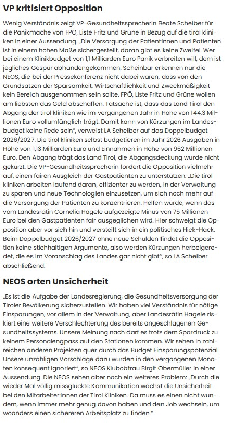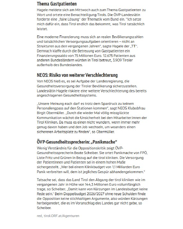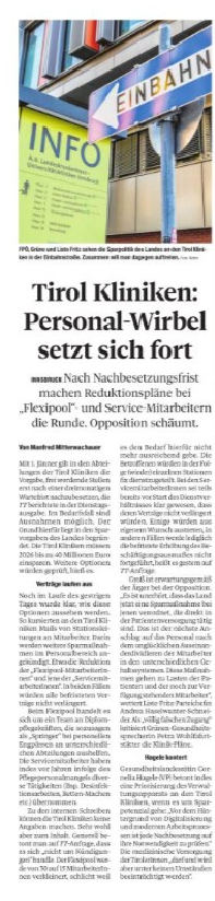 Ab 2026 sollen freiwerdende Stellen an den Tirol Kliniken erst nach einer Wartezeit von drei Monaten nachbesetzt werden. Diese aufgrund des vom Land verordneten Sparkurses beschlossene Maßnahme sorgt bei der Liste Fritz für massive Kritik und großes Unverständnis. „Dieser dreimonatige Aufnahme-Stopp ist überhaupt nicht nachzuvollziehen“, betont Liste-Fritz-Parteiobfrau Andrea Haselwanter-Schneider. „Das ist Sparen am völlig falschen Fleck und geht eindeutig zu Lasten der Tirolerinnen und Tiroler. Die Patientenversorgung ist ohnehin schon angespannt. Die Menschen suchen es sich nicht aus, wenn sie krank werden. Sie zahlen jedes Monat Beiträge und haben es sich verdient, versorgt zu werden.
