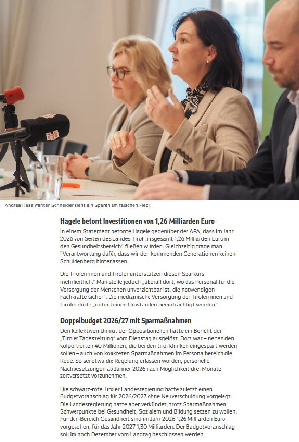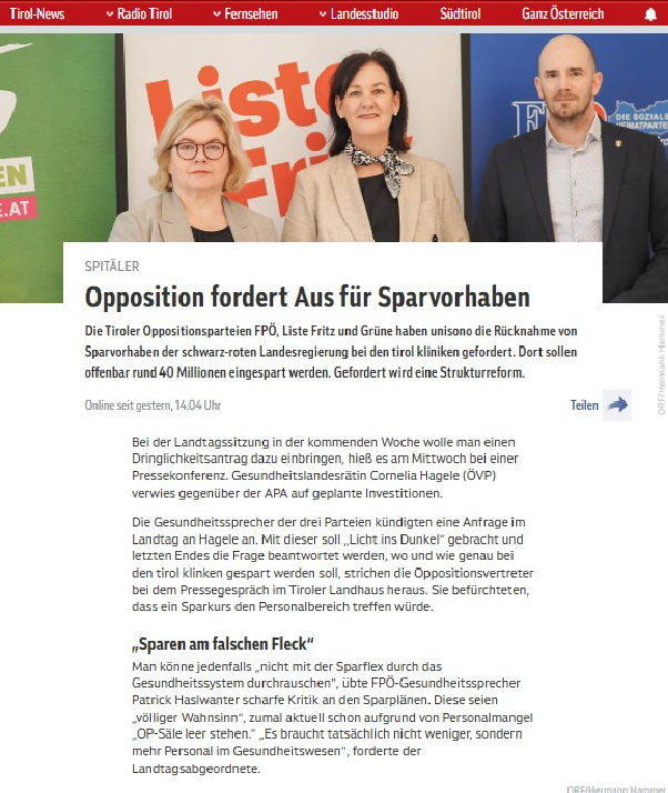 Die Liste Fritz fordert die Landesregierung daher mit Nachdruck auf, diesen Sparkurs zu stoppen. „Weitere Leistungseinschränkungen sind unbedingt zu vermeiden und entschieden abzustellen. Bei allem Verständnis, dass der Gürtel in vielen Bereichen enger geschnallt werden muss, darf dies nicht die Gesundheitsversorgung in Tirol betreffen. Die Tirolerinnen und Tiroler haben ein Recht auf eine verlässliche und sichere medizinische Versorgung. Und die Politik hat die Verantwortung, dies zu gewährleisten“, so Haselwanter-Schneider abschließend.