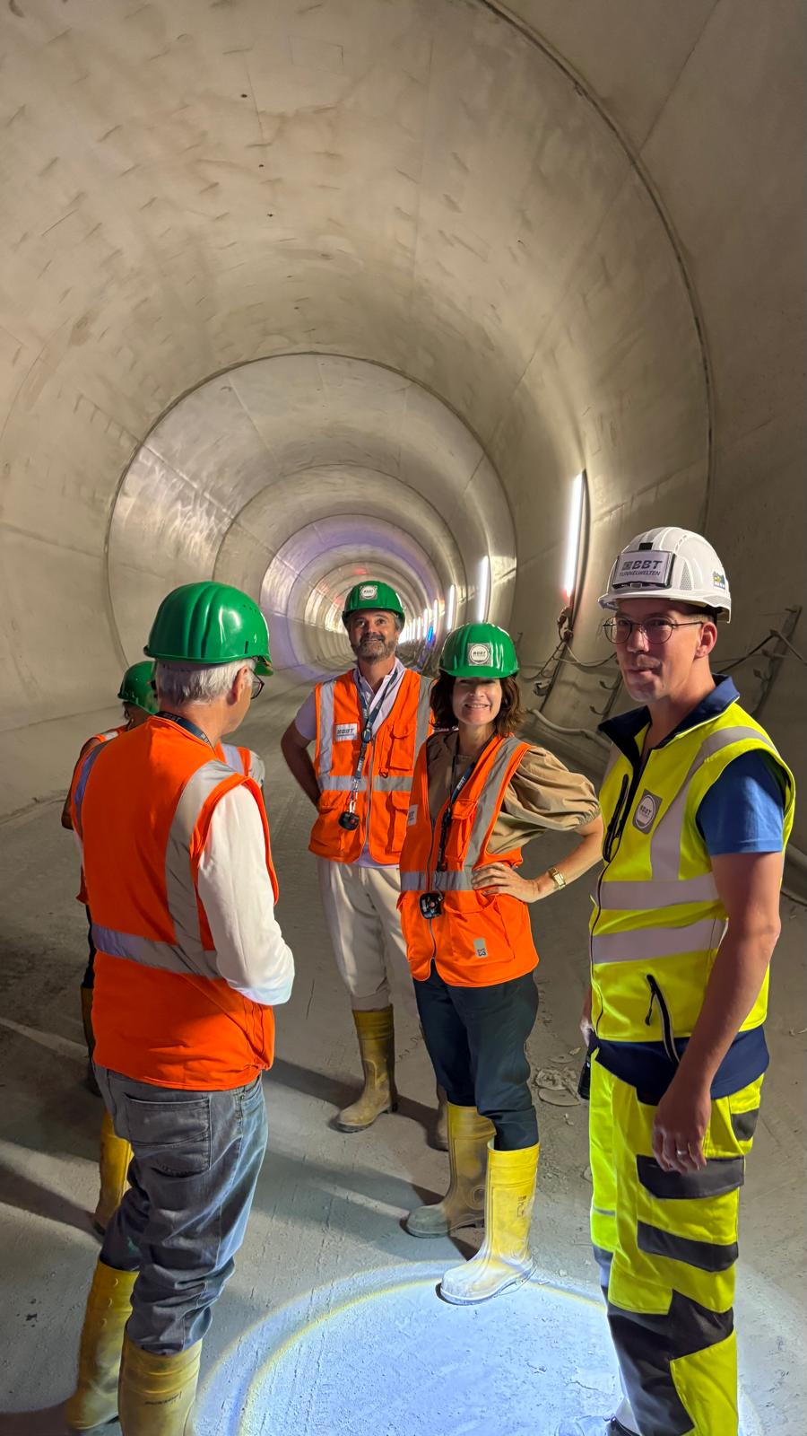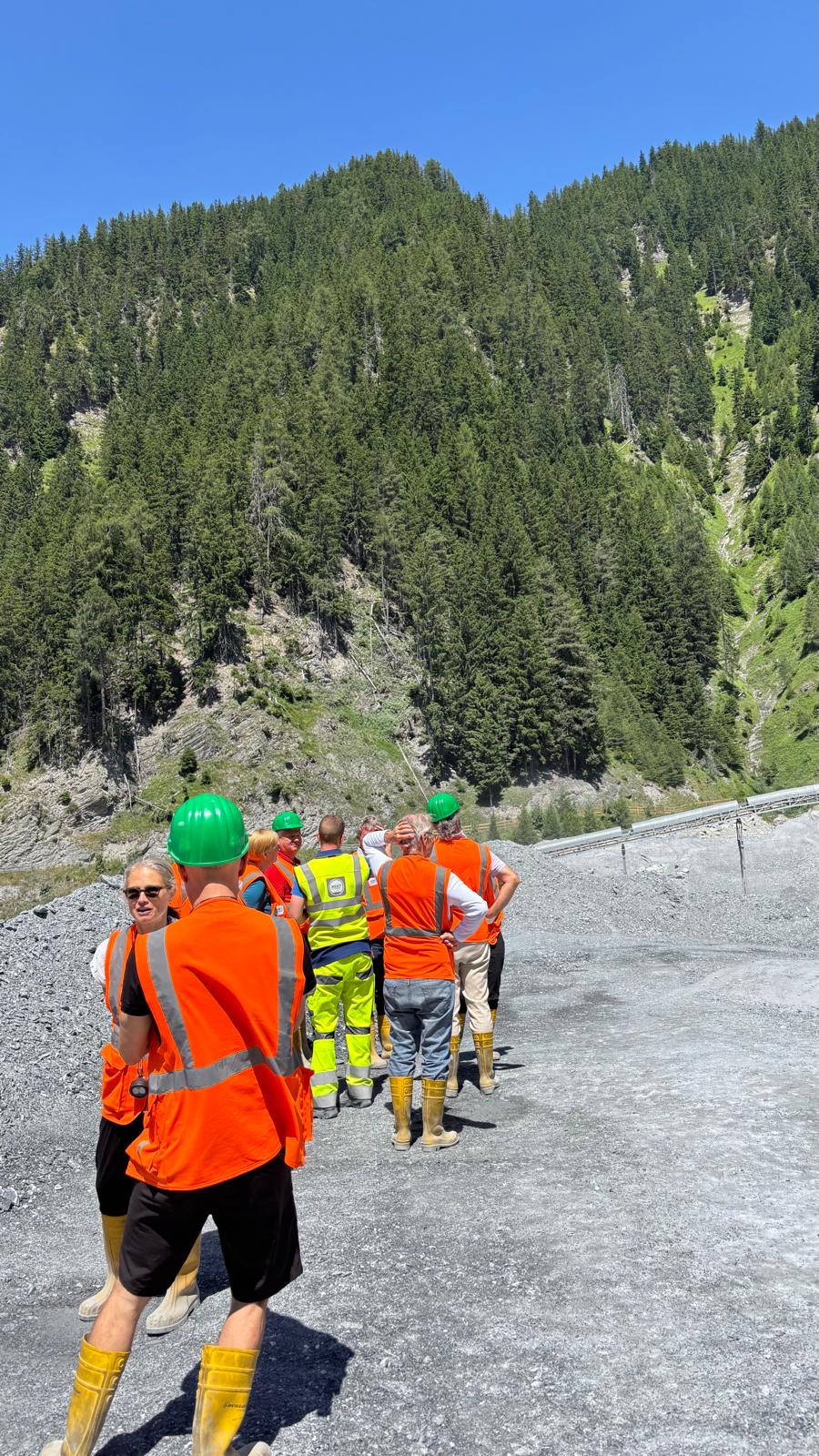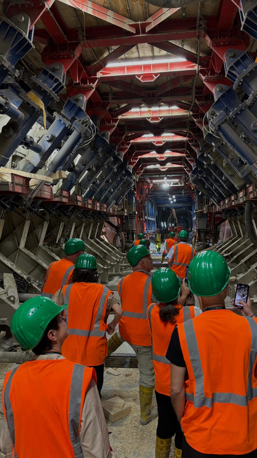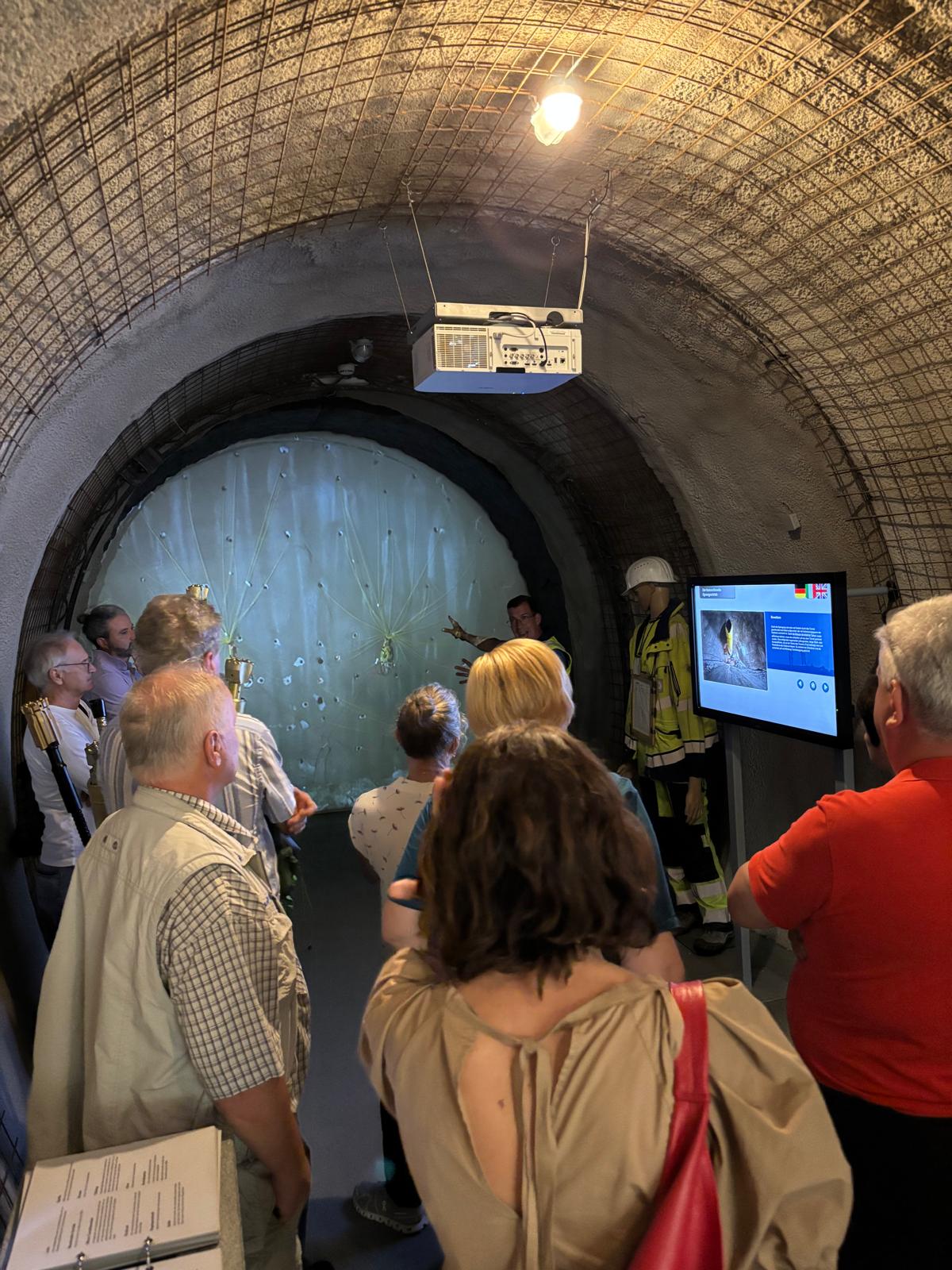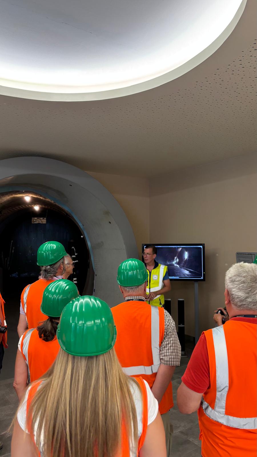 Nach einer spannenden Einführung in die Hintergründe und den aktuellen Baufortschritt des Projekts erhielten wir eine Sicherheitsunterweisung und wurden mit der entsprechenden Schutzausrüstung ausgestattet – Helm, Stiefel, Warnjacke, Schutzbrille und Stirnlampe inklusive. Dann ging es ab in den Tunnel: bei konstant angenehmen 20 °C herrschte echtes „Baustellen-Feeling“.