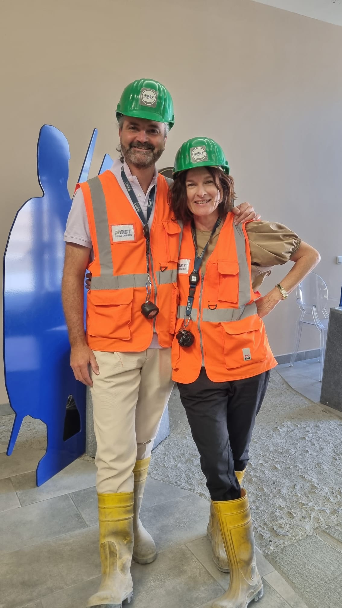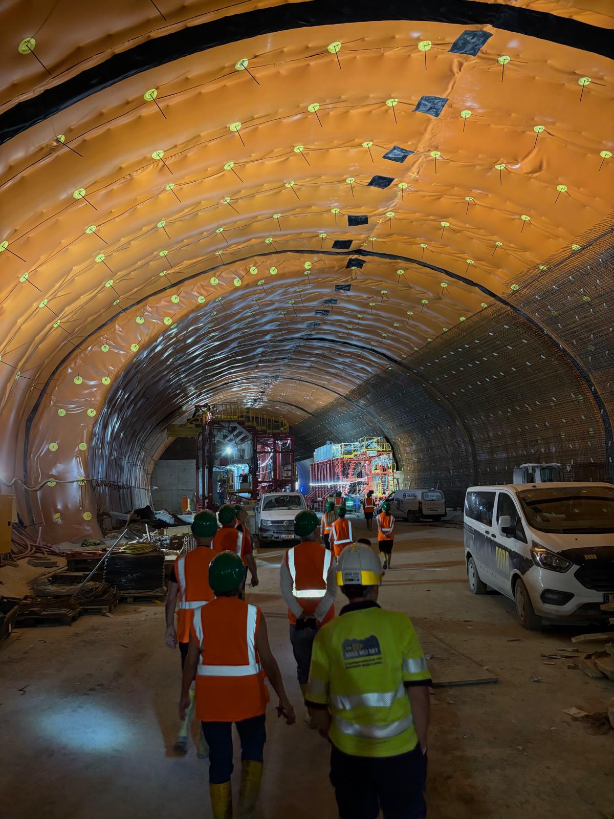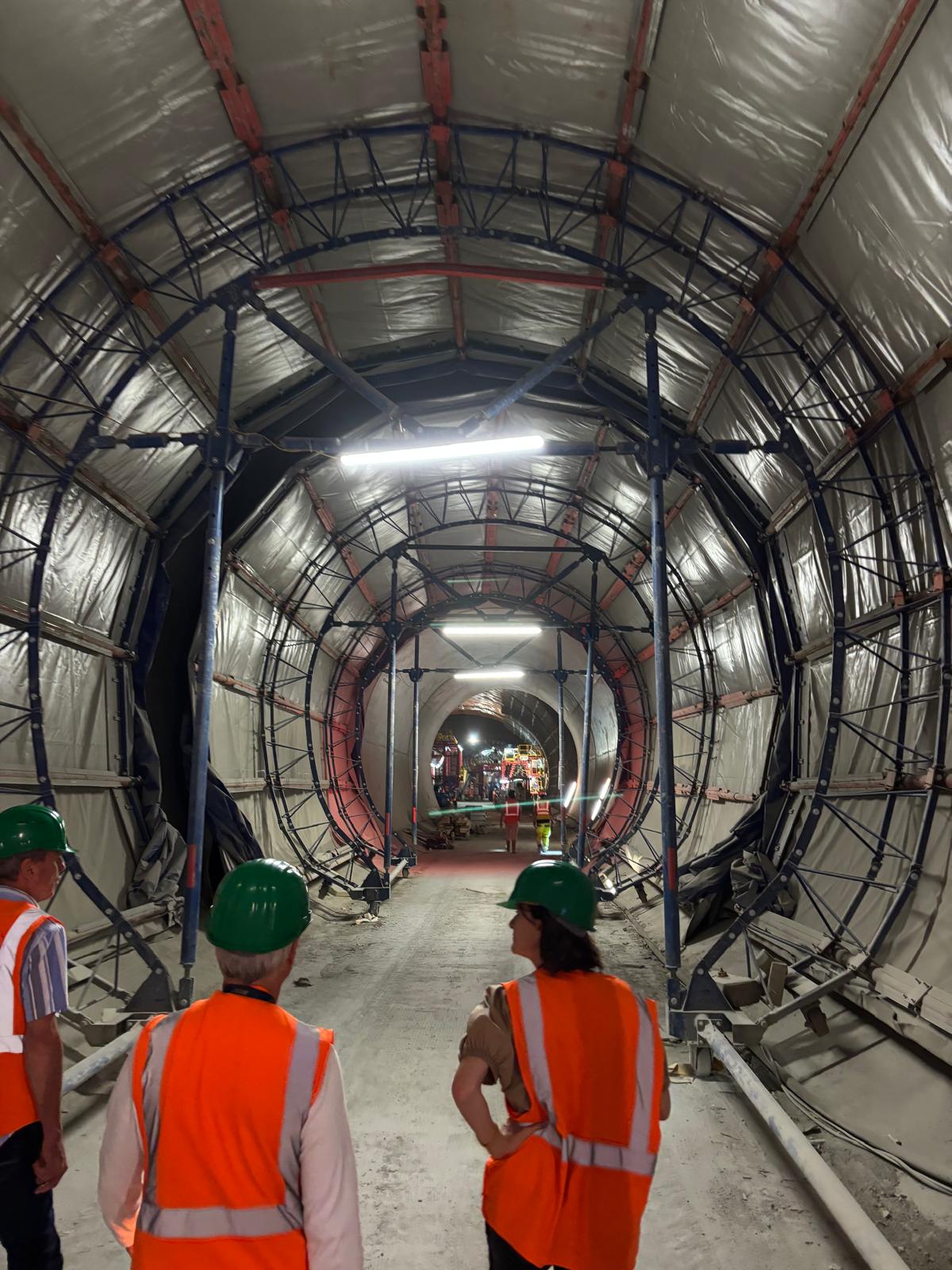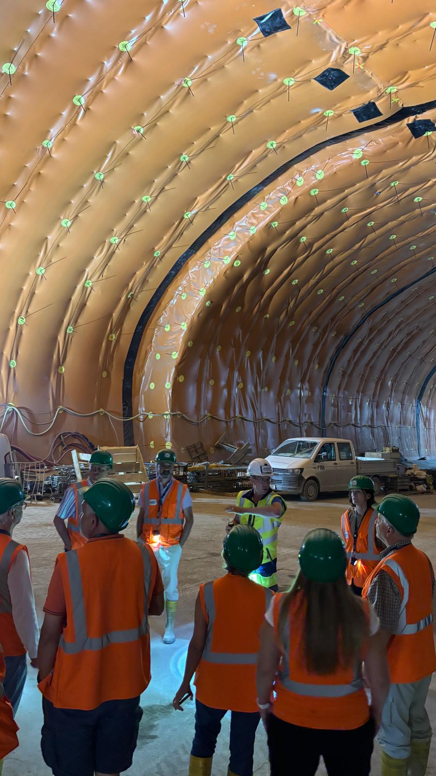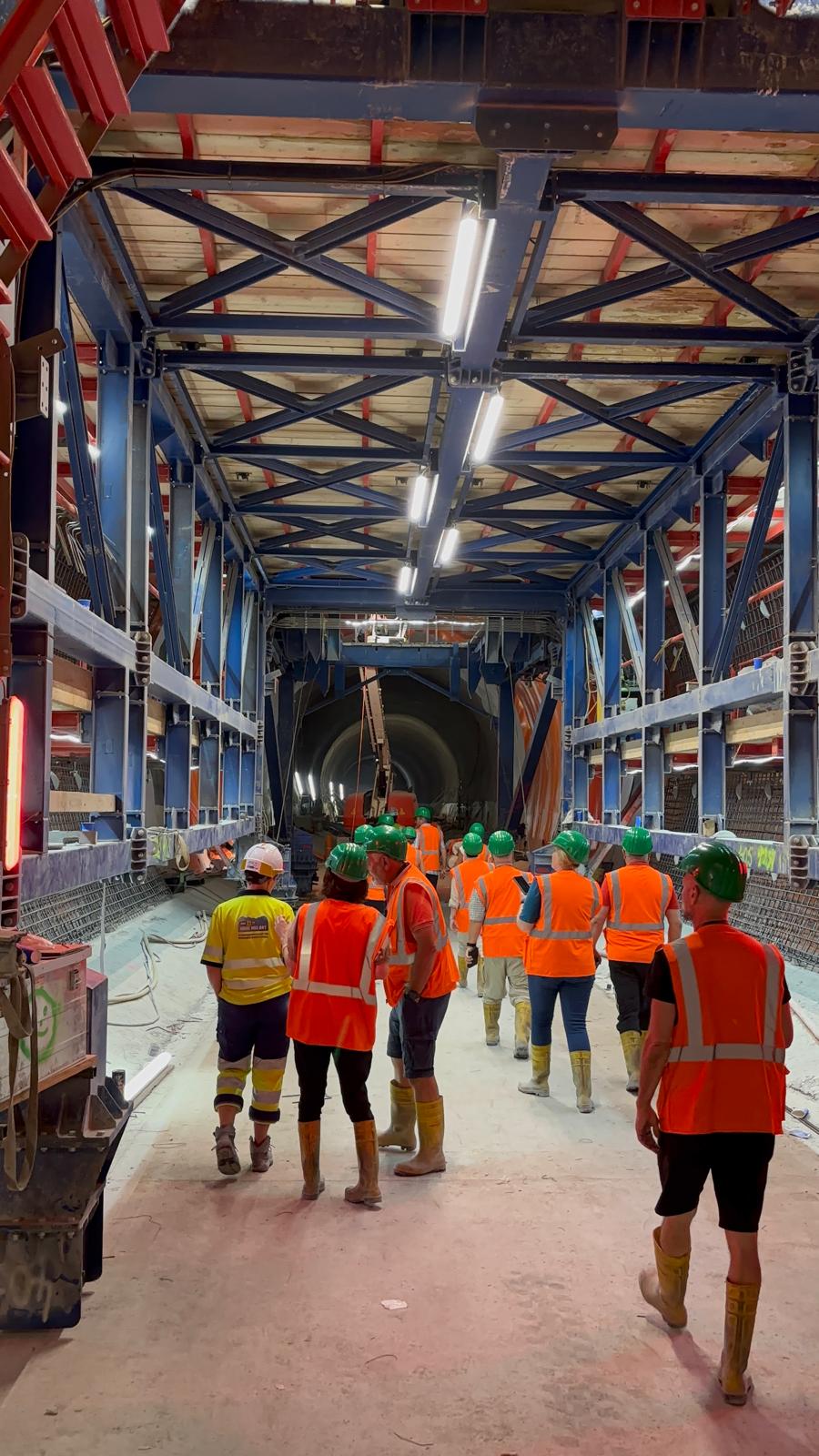 Nach einer spannenden Einführung in die Hintergründe und den aktuellen Baufortschritt des Projekts erhielten wir eine Sicherheitsunterweisung und wurden mit der entsprechenden Schutzausrüstung ausgestattet – Helm, Stiefel, Warnjacke, Schutzbrille und Stirnlampe inklusive. Dann ging es ab in den Tunnel: bei konstant angenehmen 20 °C herrschte echtes „Baustellen-Feeling“.