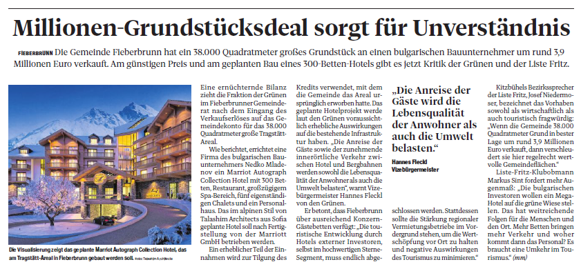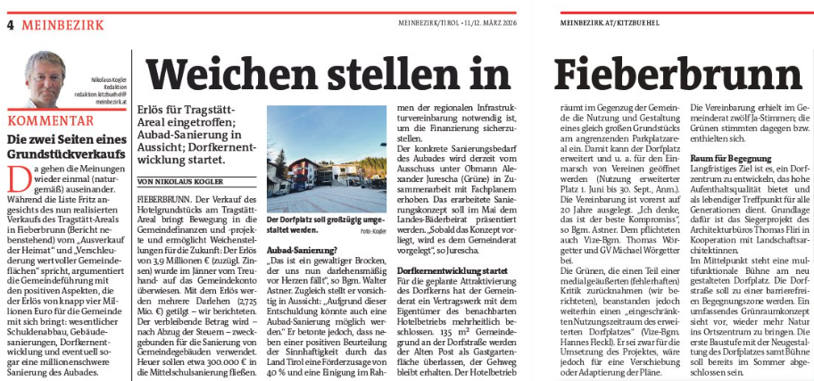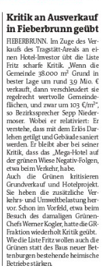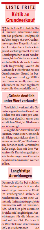 Für die Liste Fritz hat die Gemeinde Fieberbrunn rund um das geplante Hotelprojekt auf dem knapp 38.000 Quadratmeter großen Tragstätt-Areal in Fieberbrunn kein gutes Geschäft gemacht. Das sieht auch Josef Niedermoser, Bezirkssprecher der Liste Fritz im Bezirk Kitzbühel, so. „Dieses Vorhaben ist sowohl wirtschaftlich als auch touristisch fragwürdig. Wenn die Gemeinde Fieberbrunn 38.000 Quadratmeter Grund in bester Lage um rund 3,9 Millionen Euro verkauft, dann verschleudert sie hier regelrecht wertvolle Gemeindeflächen“. Tatsächlich verkauft die Gemeinde gewidmeten Grund und Boden mit 103 Euro pro m² deutlich unter dem wirklichen Wert und riskiert damit auch weitreichende Folgen für Ort, Bevölkerung und Tourismus. „So geht der Ausverkauf der Heimat, wenn eine Gemeinde ein Filetgrundstück an einen Investor verkauft“, so Niedermoser, der aber auch Verständnis dafür zeigt, dass mit dem Verkaufserlös Darlehen für Infrastrukturprojekte im Umfang von rund 2,75 Millionen Euro getilgt sowie Sanierungen von Gemeindegebäuden und der Mittelschule finanziert werden sollen. Dennoch dürften bei solchen Entscheidungen nicht nur der kurzfristige finanzielle Effekt im Vordergrund stehen. „Dass eine Gemeinde Infrastrukturprojekte finanzieren will, ist verständlich. Aber hier geht es um ein Projekt mit langfristigen Auswirkungen für die Menschen und auf den Ort. Da braucht es Weitblick und den vermisse ich“, so Niedermoser.