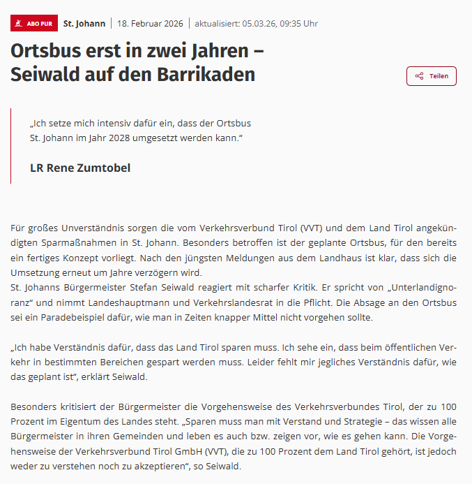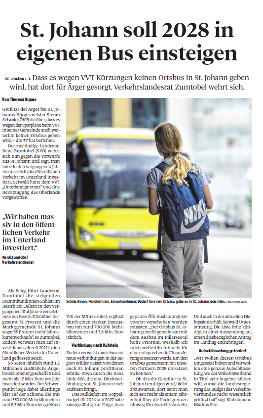 „Sinnvolle Projekte, wie den Ortsbus in St. Johann, trotz Zusagen jetzt nicht umzusetzen, halte ich für einen Fehler“, erklärt Sepp Niedermoser, Bezirkssprecher der Liste Fritz. „Wir werden uns dafür einsetzen, dass der Ortsbus kommt und die Vertaktung mit den Umlandgemeinden bestens umgesetzt wird.“ Die Verkehrsbelastung im Verkehrsknotenpunkt St. Johann sei ohnehin groß. „Ein Ortsbus könnte zur Entlastung der Bevölkerung beitragen.“