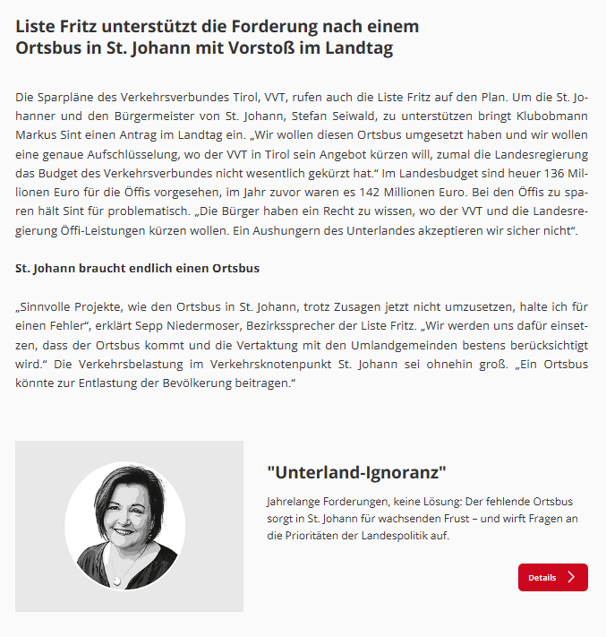 Liste Fritz unterstützt die Forderung nach einem Ortsbus in St. Johann mit Vorstoß im Landtag