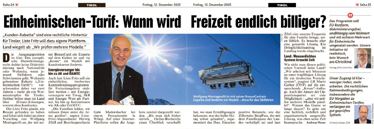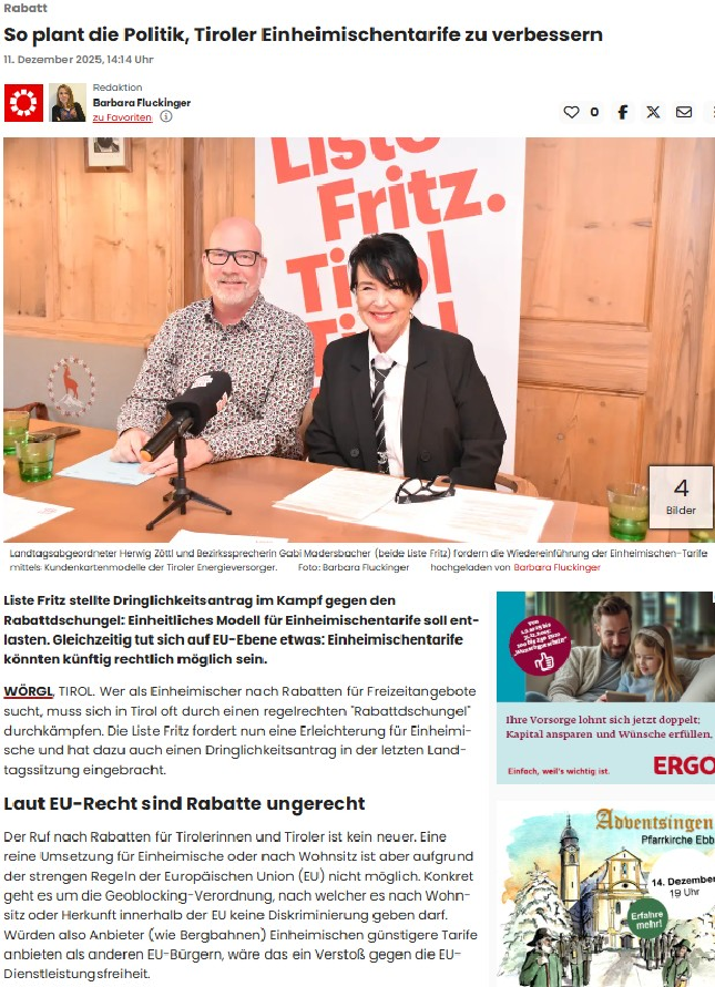 Die Liste Fritz hat im Tiroler Landtag einen Dringlichkeitsantrag eingebracht, der eine gemeinsame, tirolweite Initiative aller großen Energieversorger vorsieht. Ziel ist ein umfassendes Kundenbindungsprogramm, das allen Tirolerinnen und Tirolern kostengünstige Zugänge zu Freizeitangeboten ermöglicht. „Wir haben die Landesregierung aufgefordert, gemeinsam mit den Tiroler Energieversorgern TIWAG, IKB und Energie West die Kundenbindungsprogramme der Tiroler Energieversorger zu vereinheitlichen und zu vernetzen. Mit dem Ziel, dass die Tirolerinnen und Tiroler möglichst viele Freizeitangebote kostengünstig nutzen können. Das entlastet die Bürger, bringt den Betrieben zusätzliche Kunden und wirkt zugleich als Kundenbindung für die Energieunternehmen. Egal ob mittels Kundenkarte oder App. Das Programm soll tirolweit, EU-konform, diskriminierungsfrei, unabhängig vom Wohnort und mit echtem Mehrwert für alle Tirolerinnen und Tiroler umgesetzt werden“, betont Liste-Fritz-Landtagsabgeordneter Herwig Zöttl. Hintergrund der Initiative sind die strengen EU-Regeln zu den sogenannten „Einheimischen-Tarifen“. Derzeit bemühen sich viele Institutionen und Unternehmen, darunter die Arbeiterkammer sowie die Stromanbieter TIWAG, IKB und Energie West, um neue, leistbare Angebote für Einheimische anbieten zu können. Die Energie West befindet sich zudem in Verhandlungen mit der AK Tirol über ein gemeinsames Angebot für AK-Mitglieder. Darüber hinaus gibt es auch erste Bestrebungen, tirolweit eine gemeinsame Vorteilskarte aller Stromanbieter zu entwickeln. Allerdings sind noch grundlegende rechtliche Fragen abzuklären. „Unsere Initiative ist also kein Wunsch ans Christkind, sondern könnte bald Realität werden“, so Zöttl.