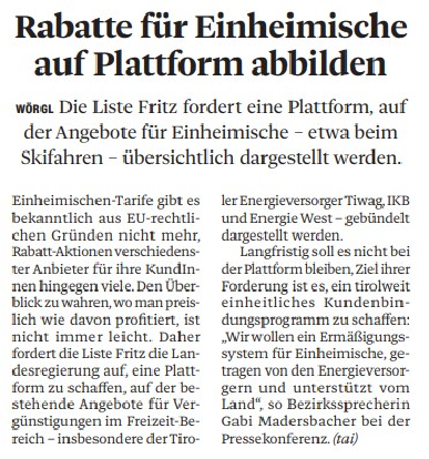 Zahlreiche Seilbahnunternehmen und Skigebiete arbeiten ebenfalls an attraktiven Ermäßigungsmodellen. Im Bezirk Kufstein etwa bietet das Ski Juwel Alpbach/Wildschönau diverse Rabatte für unterschiedliche Zielgruppen von Ladies- und Men’s Days bis hin zu Familien- oder Seniorenangeboten an. Auch in Kühtai und anderen Skigebieten bestehen bereits Kooperationen mit Stromanbietern. „Das sind viele lobenswerte Initiativen. Aber viele kleine Insellösungen und meist wissen viele Tirolerinnen und Tiroler gar nicht, welche Vorteile sie als Kunden bei einem Freizeitangebot haben“, erklärt Bezirkssprecherin Gabi Madersbacher, die sich in diesem Zusammenhang eine zentrale Informations-Homepage des Landes wünscht. „Die Stoßrichtung der Liste Fritz ist klar: Wir wollen ein einheitliches, tirolweites Ermäßigungssystem für Einheimische, getragen von den Energieversorgern und unterstützt vom Land. Bis dieses umgesetzt ist, braucht es für die Tirolerinnen und Tiroler eine zentrale Info-Homepage, auf der mit einem Klick ersichtlich ist, welches Freizeitangebot für Kunden Rabatte bereithält. Das schafft Transparenz und bringt sofort einen Mehrwert für die Einheimischen.“