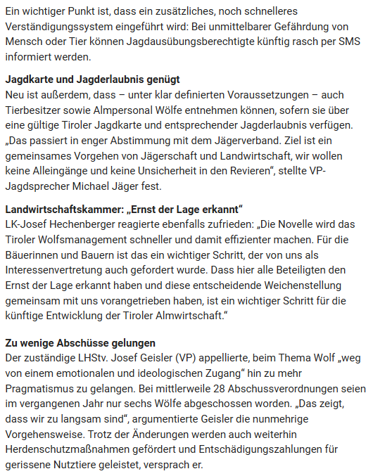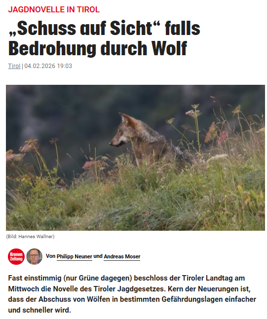 Das Kärntner Alm- und Weideschutzgesetz erlaubt bereits seit 2024 die gezielte Tötung von Wölfen durch befugtes Jagdpersonal, wenn das Leben und die Gesundheit von Nutztieren konkret gefährdet oder unmittelbar bedroht sind. Dieses Modell bietet Rechtssicherheit und hat sich in der Praxis bewährt.