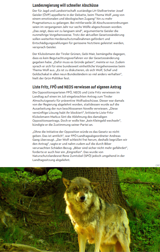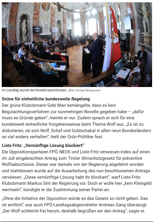 Angesichts der drastisch zunehmenden Wolfsrisse auf Tirols Almen fordern FPÖ, Liste Fritz und NEOS in einem gemeinsamen Dringlichkeitsantrag für den Juli-Landtag eine sofortige Änderung des Tiroler Almschutzgesetzes. Ziel ist es, Nutztiere auf Tirols Almen zu schützen. Mittels Gesetzesänderung wollen die Oppositionsparteien rechtlich sicherstellen, dass Wölfe entnommen werden können, wenn sie eine Gefahr oder Bedrohung für Nutztiere sind. Als Vorbild gilt das entsprechende Gesetz in Kärnten. Die Lage auf den Tiroler Almen hat sich mit Beginn der diesjährigen Almsaison zugespitzt: Innerhalb von nur 19 Tagen wurden 114 Risse an Nutztieren dokumentiert. Ärger, Frust und Wut bei den Schafbauern wachsen und viele sehen sich trotz gesetzlicher Regelungen weitgehend schutzlos ausgeliefert. Denn der Abschuss von Risiko- und Schadwölfen via Tiroler Jagdgesetz ist kompliziert und das Almschutzgesetz verweist lediglich auf Maßnahmen des Herdenschutzes, etwa mit Zäunen oder Herdenschutzhunden. Die Landesregierung hat festgestellt, dass keine der rund 2.100 Tiroler Almen für Herdenschutz geeignet ist.