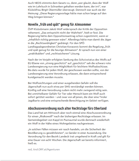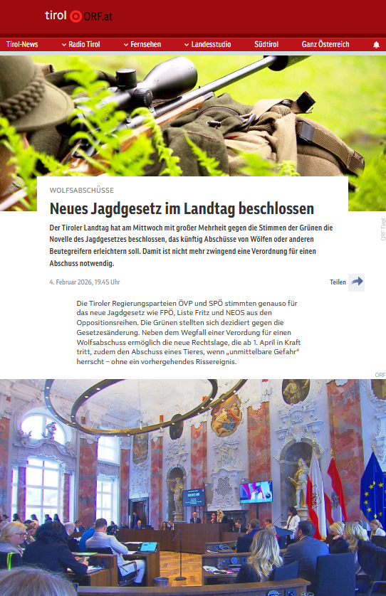 Für FPÖ-Klubobmann Markus Abwerzger zeigt sich aufgrund der dramatischen Vorgänge in den letzten Wochen, dass sich die jahrelange Wolfsromantik der Tiroler ÖVP nun als Damoklesschwert für die heimische Almwirtschaft herausgestellt hat. „Die von der schwarz-roten Landesregierung geplante Novelle des Jagdgesetzes im Jahr 2026 kommt viel zu spät. Auch heuer sind die Böden der Tiroler Almen bereits mit Blut getränkt“, so Abwerzger, für den das jahrelange Zaudern der ÖVP fatale Folgen hat. Liste Fritz-Klubobmann Markus Sint nimmt die Hilferufe der Tiroler Bauern ernst und fordert zum schnellen Handeln auf. „Uns als Liste Fritz ist es wichtig, den Bauern zu helfen, die Almen zu schützen, Tierleid zu verhindern und den Tirolern wie Touristen ein Gefühl der Sicherheit zu geben. Wenn ein Raubtier wie der Wolf Nutztieren und Menschen gefährlich nahekommt, muss die Politik handeln. Wir laden ÖVP und SPÖ ein, diesen Weg der Vernunft und Sicherheit gemeinsam mit uns zu gehen.“ NEOS-Klubchefin Birgit Obermüller sieht ebenfalls dringenden Handlungsbedarf. „Die Almwirtschaft ist nicht nur für die Bauernschaft überlebenswichtig, sondern stiftet auch einen immensen Nutzen für den Tourismus und die heimische Wertschöpfung. Wer glaubt, dass sich Weidetiere, Menschen und Wölfe einen Lebensraum teilen können, ignoriert die Realität auf unseren Almen.“ Für Stefan Brugger, Obmann des Vereins Weidezone, muss das Massaker auf den Tiroler Almen, verursacht durch den Wolf, der im Blutrausch weit mehr Tiere tötet als er frisst, endlich aufhören: „Wir brauchen endlich Weidezonen, in denen unsere Tiere geschützt sind. Und dazu ist die Änderung des Tiroler Almschutzgesetzes unbedingt notwendig.“