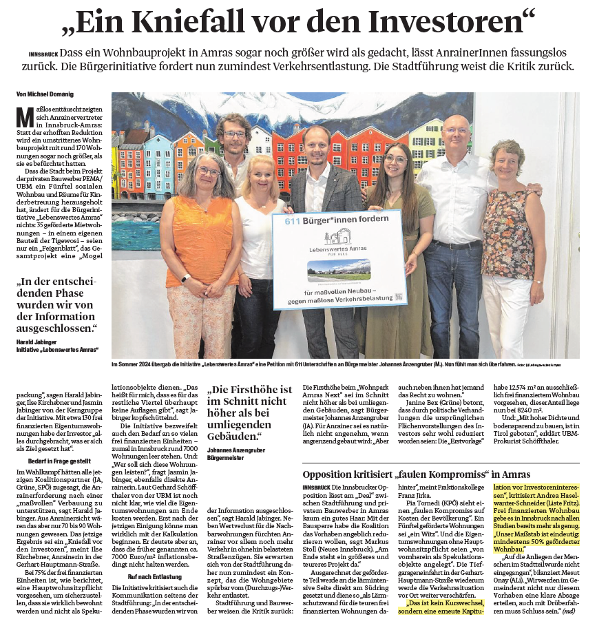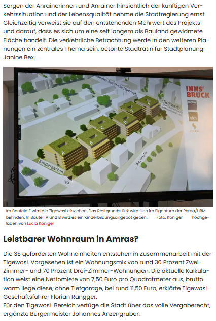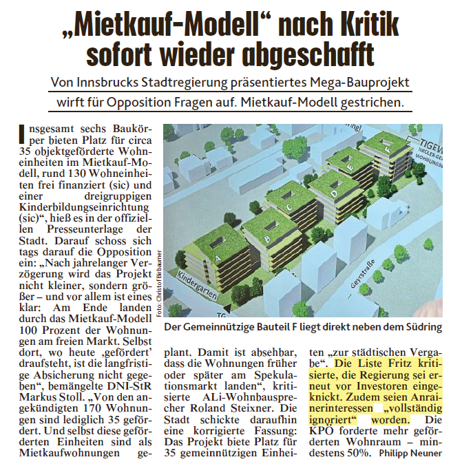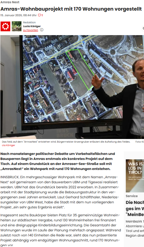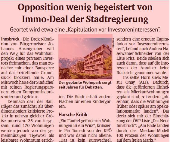 Innsbruck erlebt den nächsten Kniefall vor Wohnbau-Investoren. Statt der ursprünglich geplanten 140 frei finanzierten Wohnungen sollen in Amras nun 165 „gemischte“ Wohnungen entstehen. Für die Liste Fritz ist klar: Der Ausverkauf der Stadt geht unter Bürgermeister Anzengruber und seiner Stadtregierung ungebremst weiter. Mit tatkräftiger Unterstützung der SPÖ. „Das ist kein Kurswechsel, sondern eine erneute Kapitulation vor Investoreninteressen“, kritisiert Liste-Fritz-Gemeinderätin Andrea Haselwanter-Schneider. „35 geförderte Wohnungen sind angesichts der dramatischen Wohnsituation ein wohnungspolitischer Offenbarungseid.“