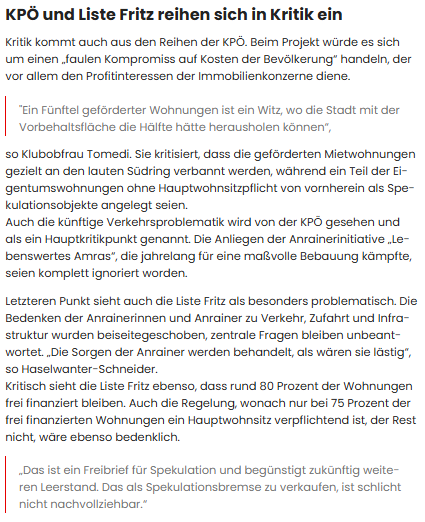 Liste Fritz kritisiert Projekt scharf: Rund 20 Prozent geförderte Wohnungen sind viel zu wenig